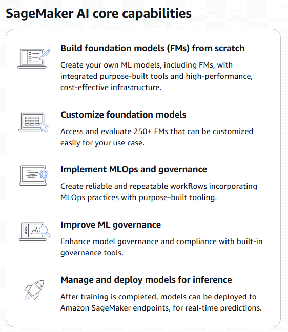 SageMaker provides a wide range of features that cover different stages of the machine learning lifecycle. Overall, it is a managed AWS service for training and deploying models on managed infrastructure, abstracting most of the heavy lifting.
