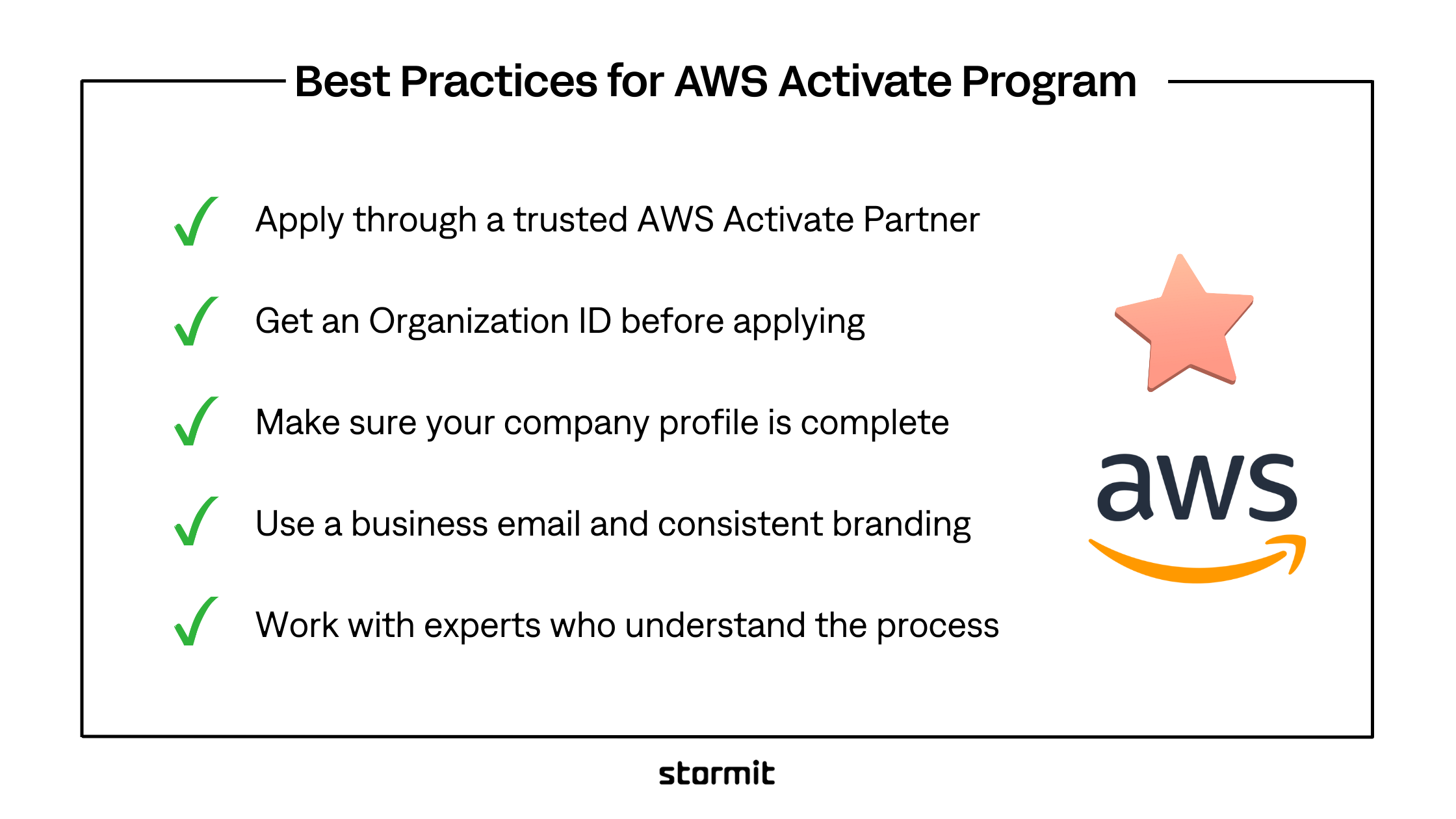 Affiliating with a VC firm, accelerator, incubator, or AWS consulting partner gives your application added credibility. These organizations are recognized by AWS and have a direct channel to Activate approvals. Startups backed by partners often receive faster decisions and larger credit packages.